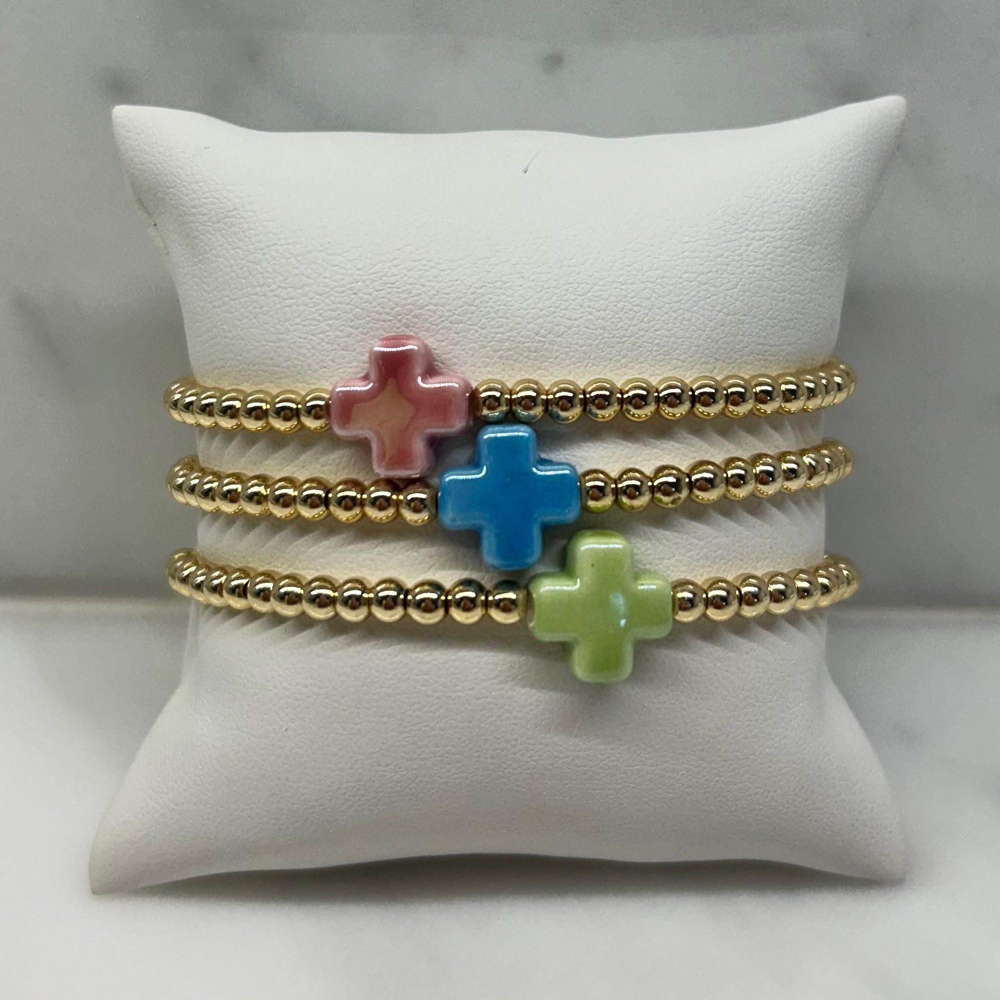 4mm 14k Gold Plated Brass Beads with a Ceramic Cross on Stretchy String.