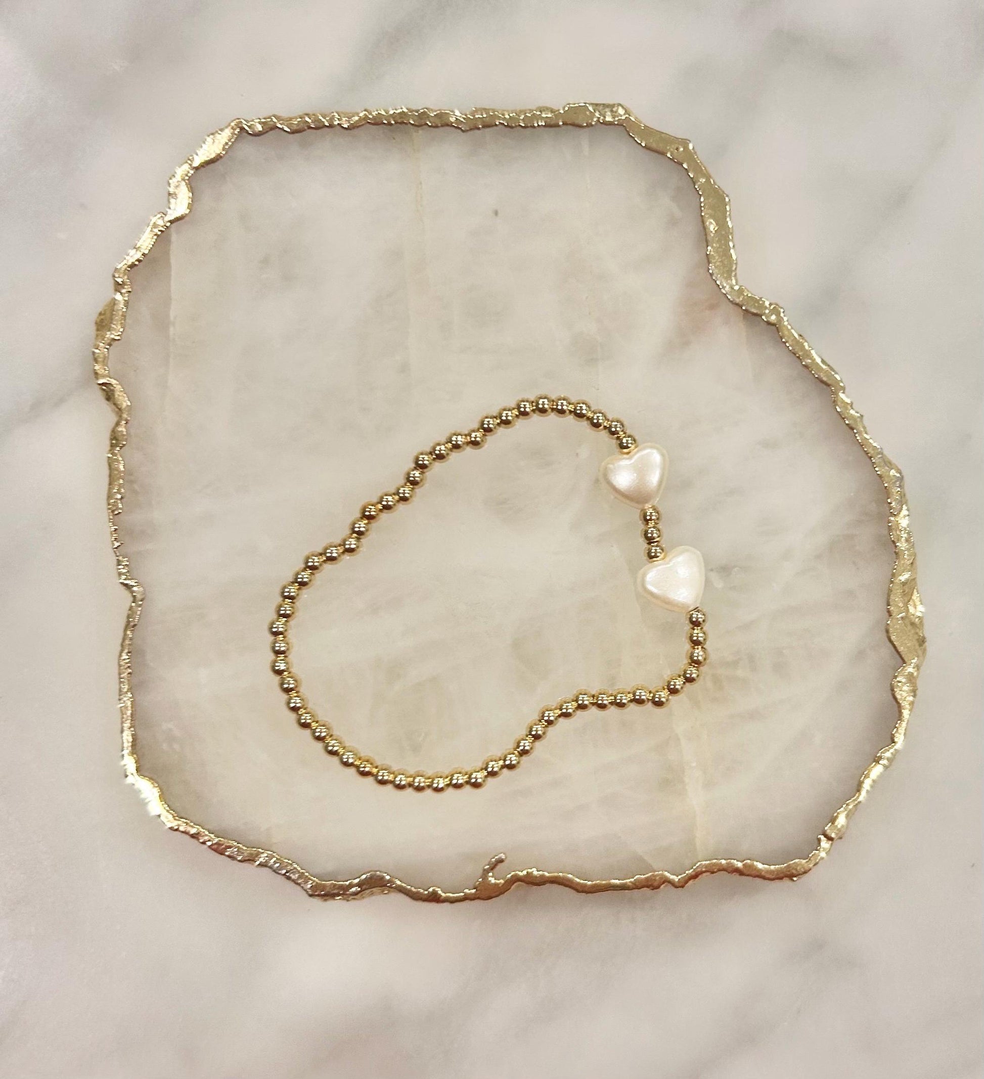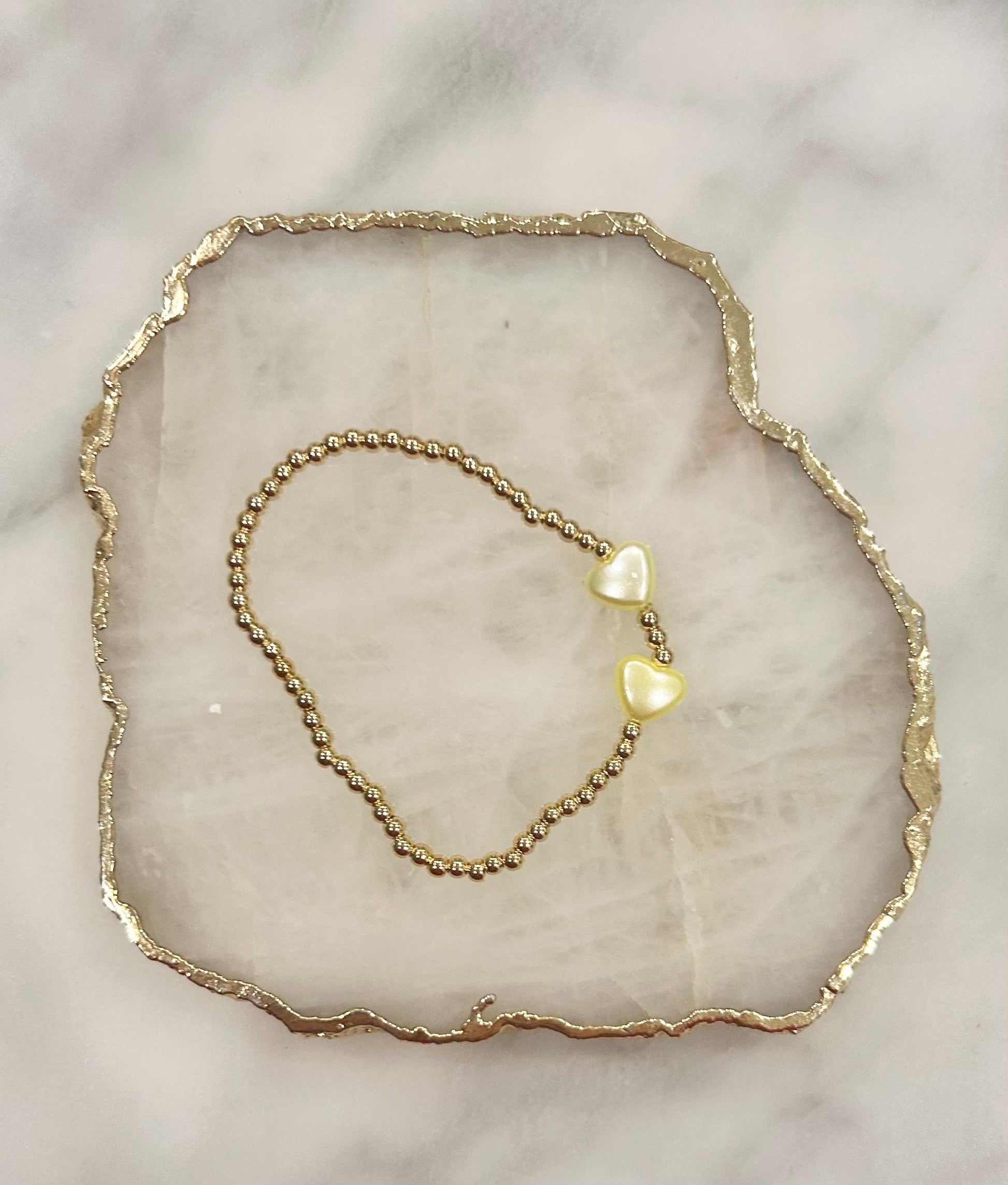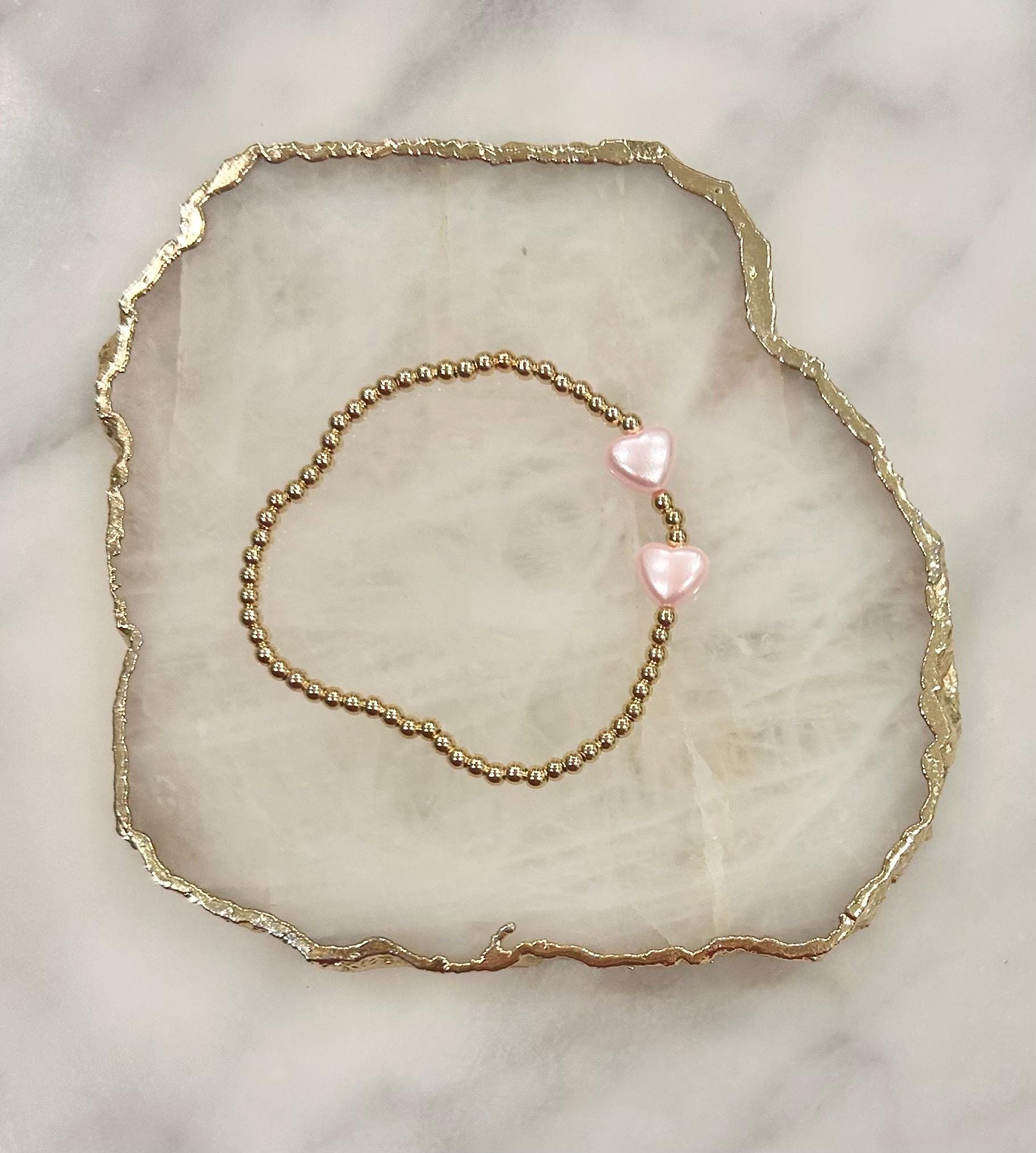 3mm 14k Gold Plated Brass Beads with Heart Charms on Stretchy String.