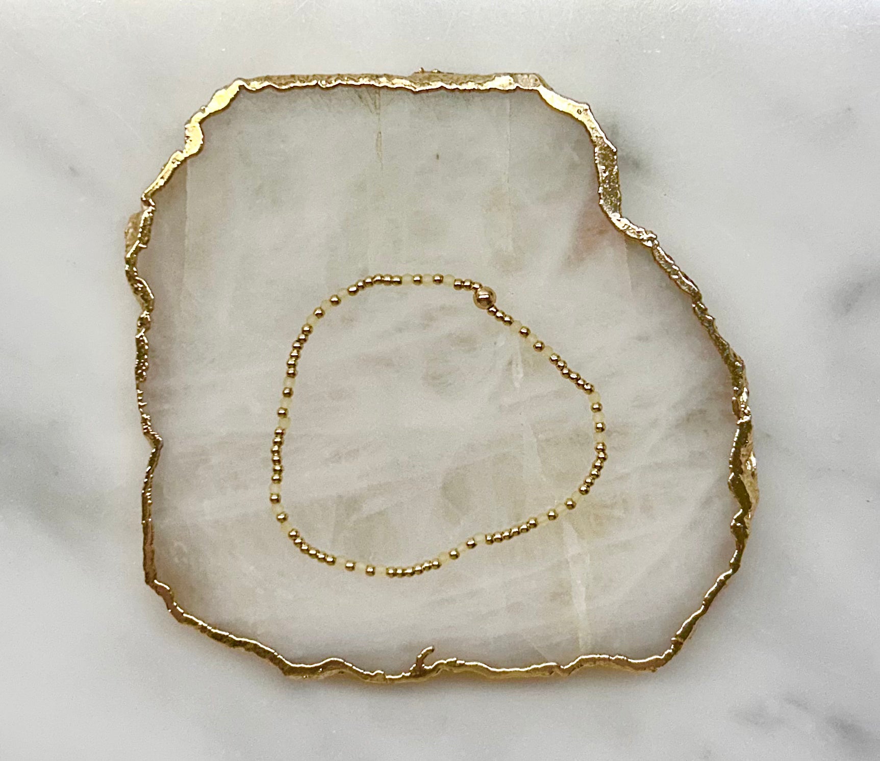 Amici Jewels gold jewelry is made with 14K gold-plated beads that is waterproof, workout proof & perfect for everyday wear. To preserve its shine, avoid harsh chemicals and gently clean with a soft cloth.
