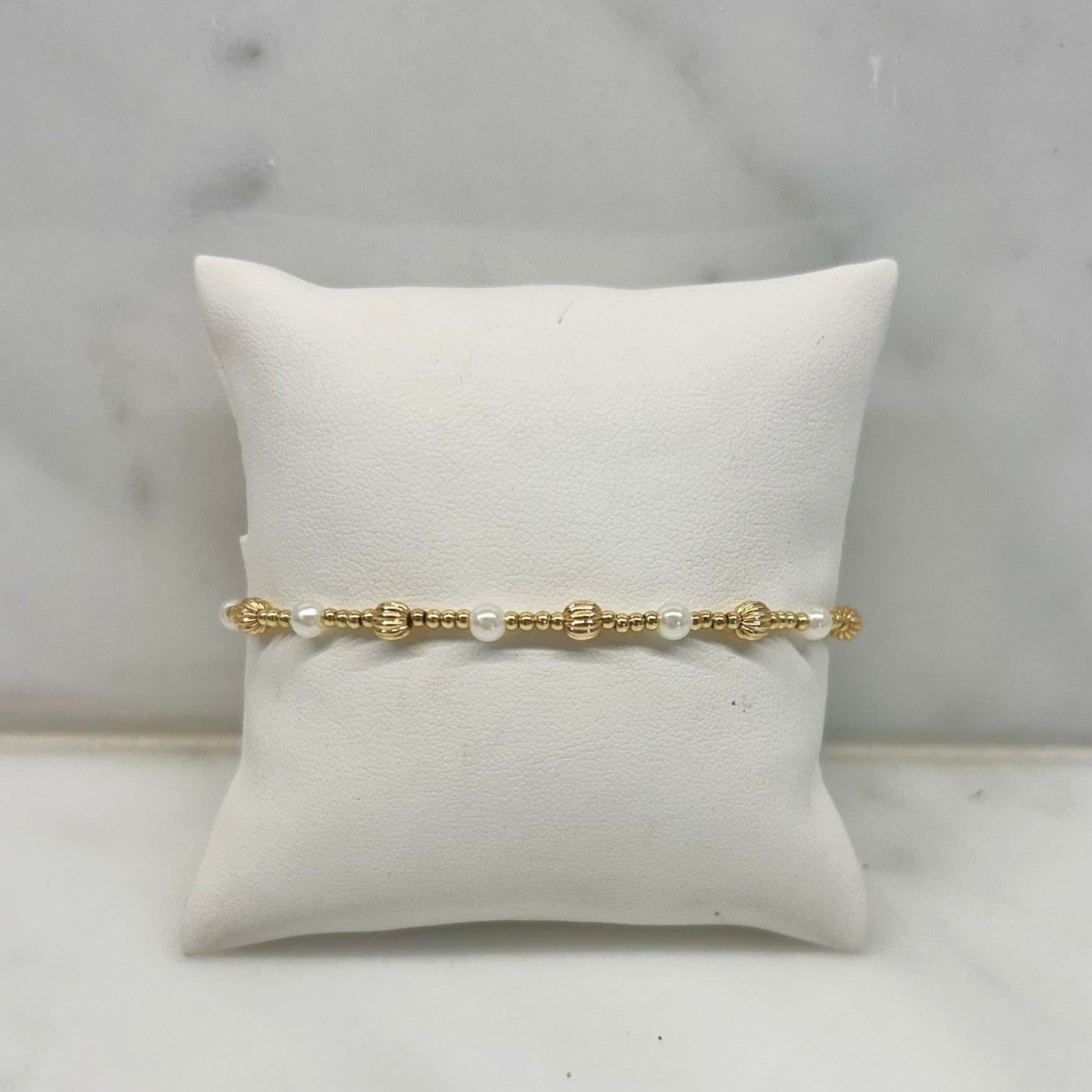 The Amata Bracelet is a beautifully detailed design crafted with radiant 14k gold plating. Featuring textured gold accent beads paired with soft pearl details, this bracelet offers a perfect balance of elegance and dimension. The intricate beadwork adds visual interest while maintaining a delicate, timeless feel.