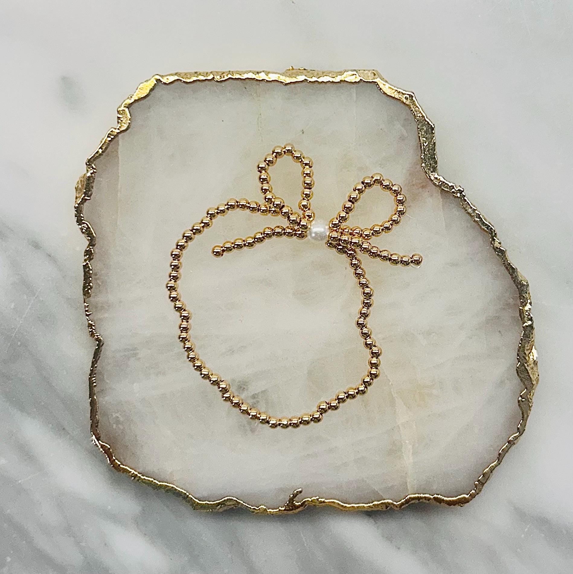 Delicate with a playful twist, the Mini Bow Bracelet adds a charming touch to everyday styling. Crafted with polished 14K gold plated beads and finished with a dainty bow detail, this piece blends feminine elegance with modern simplicity. Subtle yet eye-catching, it’s perfect worn alone or layered for a refined, curated look.