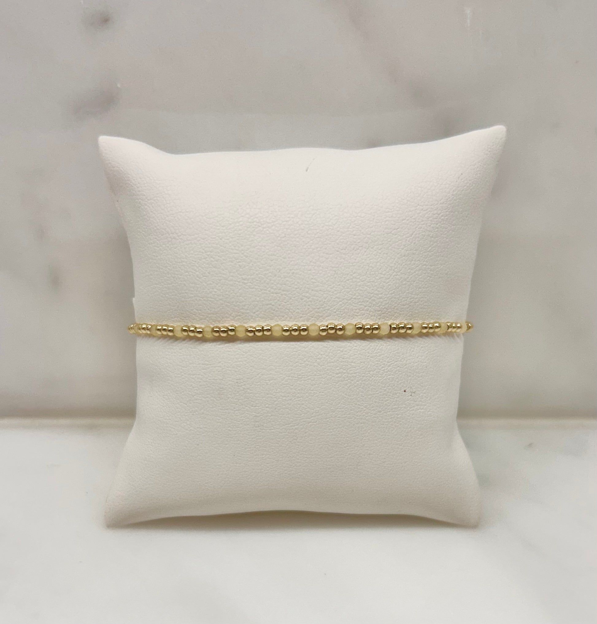 The Naples Bracelet features delicate strands of 14k gold-plated beads accented with soft porcelain beads in a muted, coastal-inspired palette. Thoughtfully balanced and lightweight, it offers subtle color without overwhelming the design.