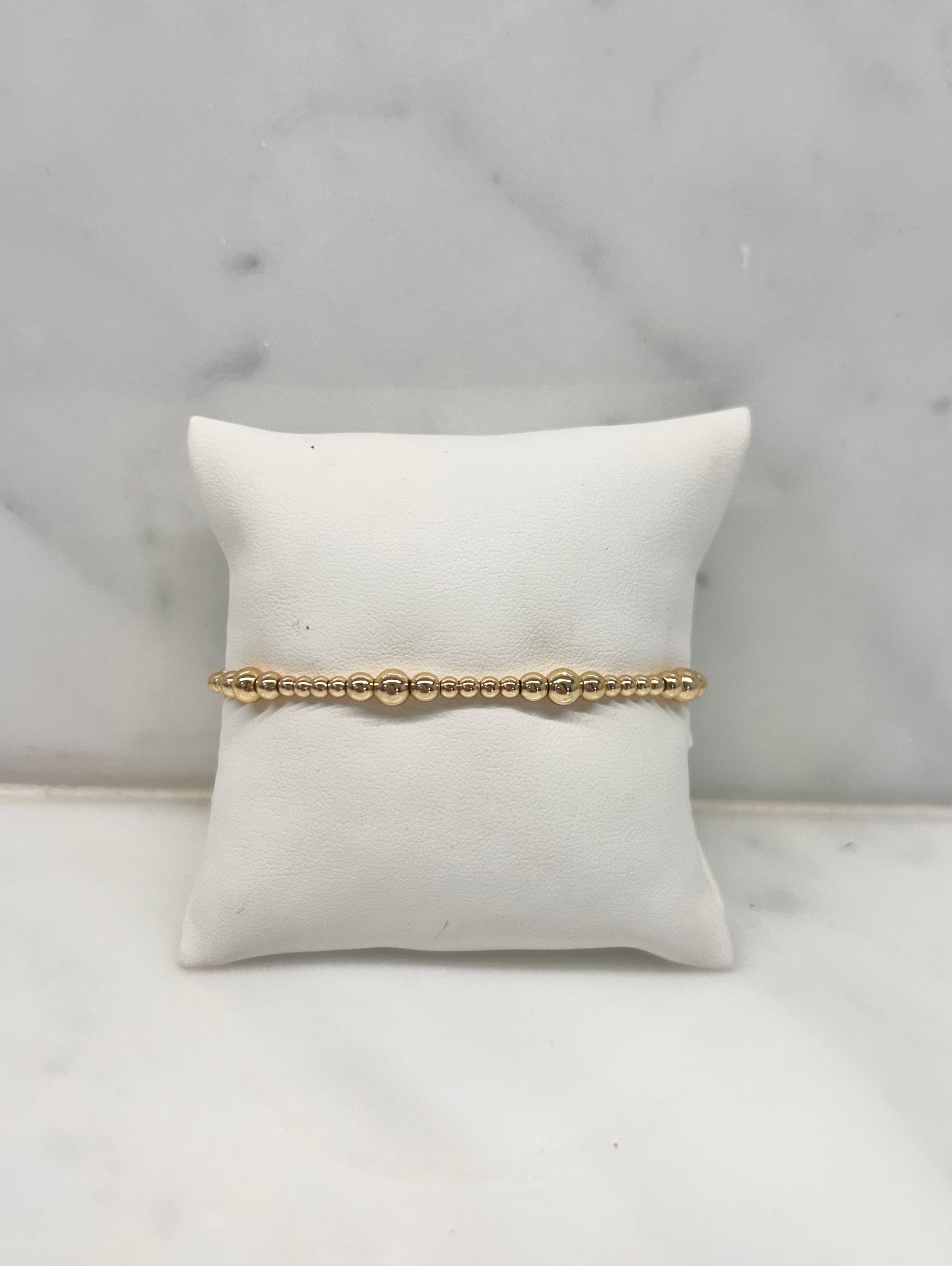 The Stella Bracelet is a refined blend of elegance and simplicity, crafted with luminous 14k gold plating. Featuring a delicate row of polished gold beads accented by subtle larger bead details, this bracelet creates soft dimension and eye-catching shine. Its balanced design makes it ideal for stacking or wearing alone for a clean, elevated look.